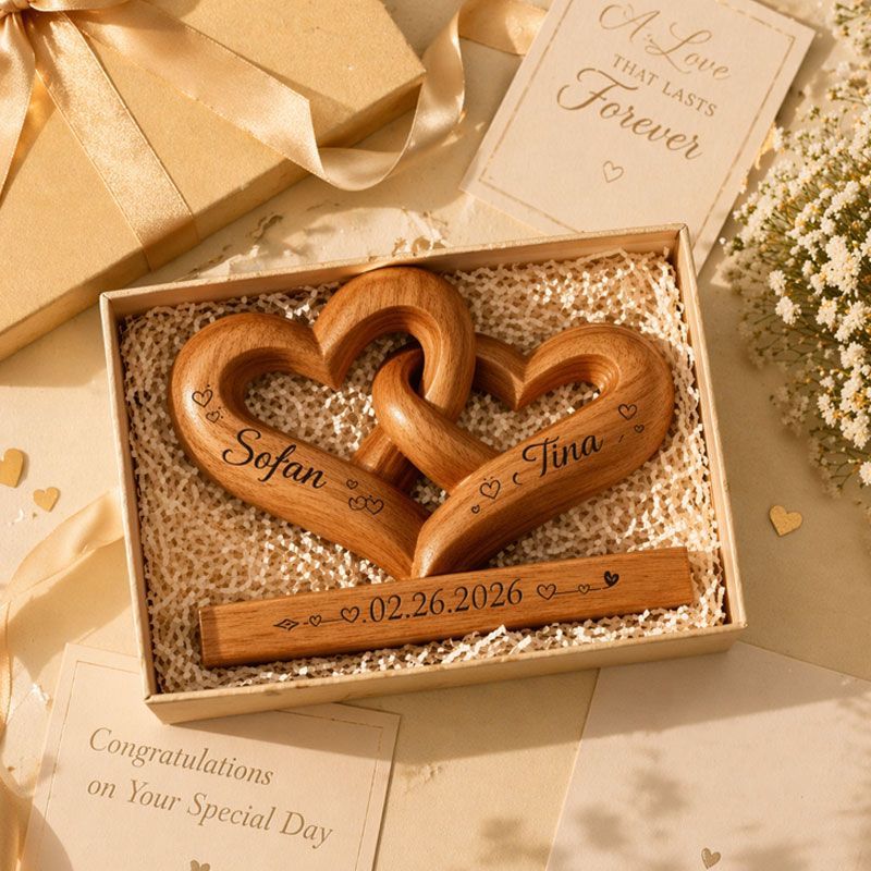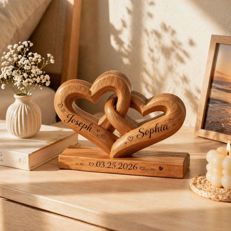 Zwei Herzen, eine Geschichte. Diese handgefertigte Holzplaque mit ineinandergreifenden Herzen symbolisiert die einzigartige Verbindung zweier Menschen – perfekt als Geschenk für Paare, Verlobte, Ehepartner oder Jubiläen.