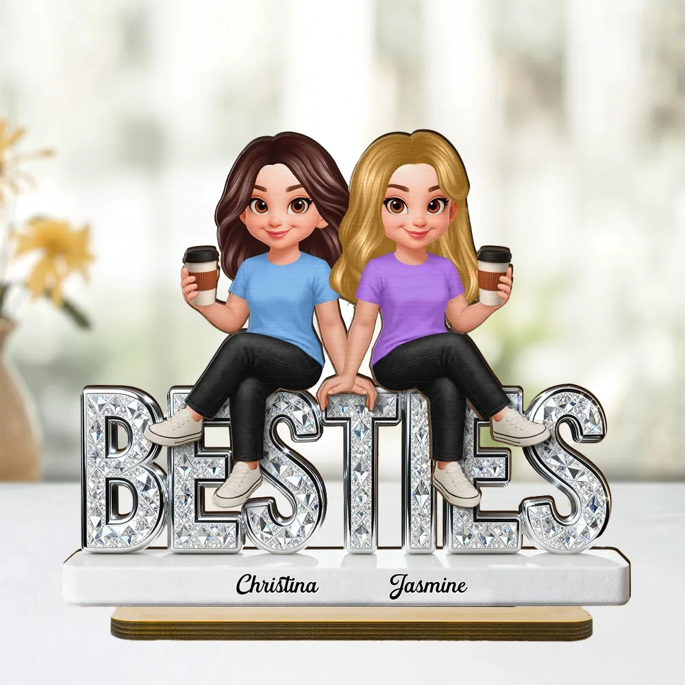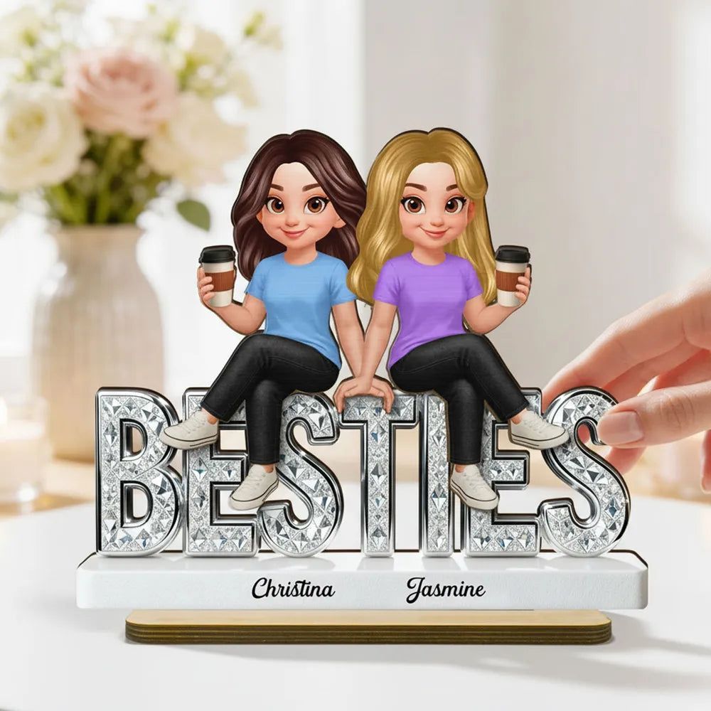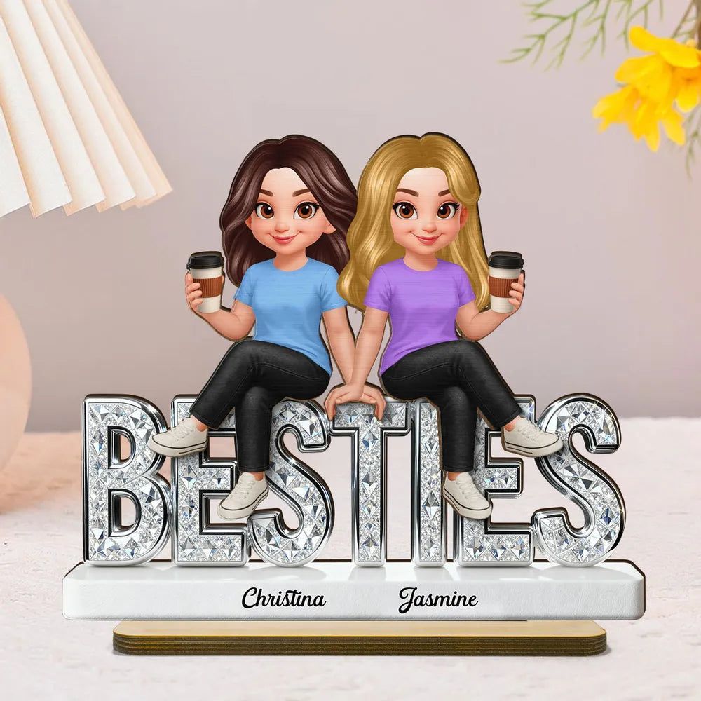 Personal isierte Besties 2-lagige Holz plakette, niedliche Cartoon-beste Freunde, die Kaffee halten, einzigartiges Geschenk für den besten Freund