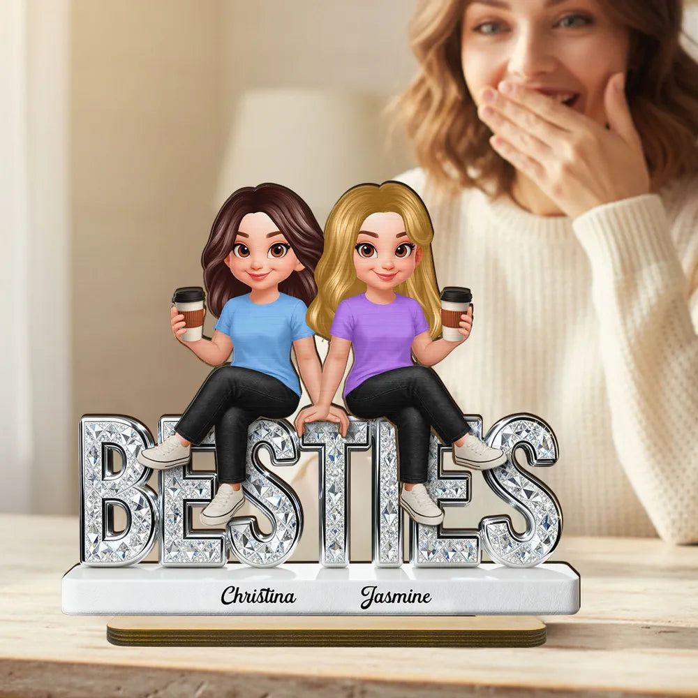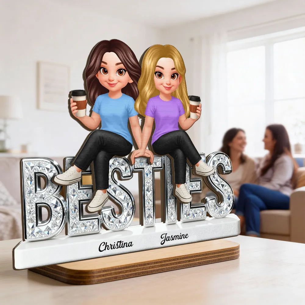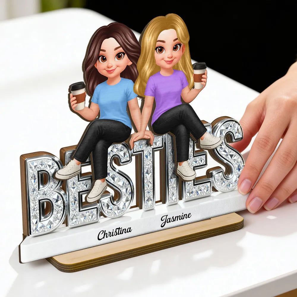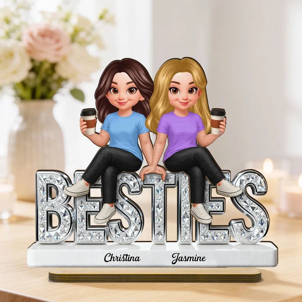 Personal isierte Besties 2-lagige Holz plakette, niedliche Cartoon-beste Freunde, die Kaffee halten, einzigartiges Geschenk für den besten Freund