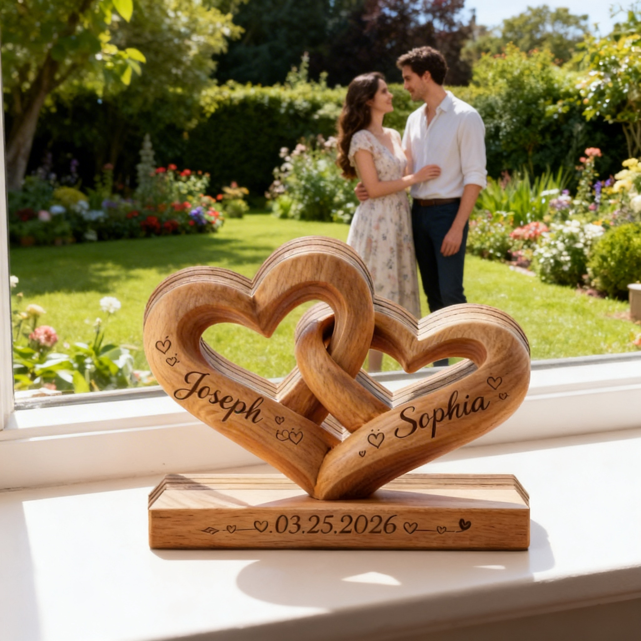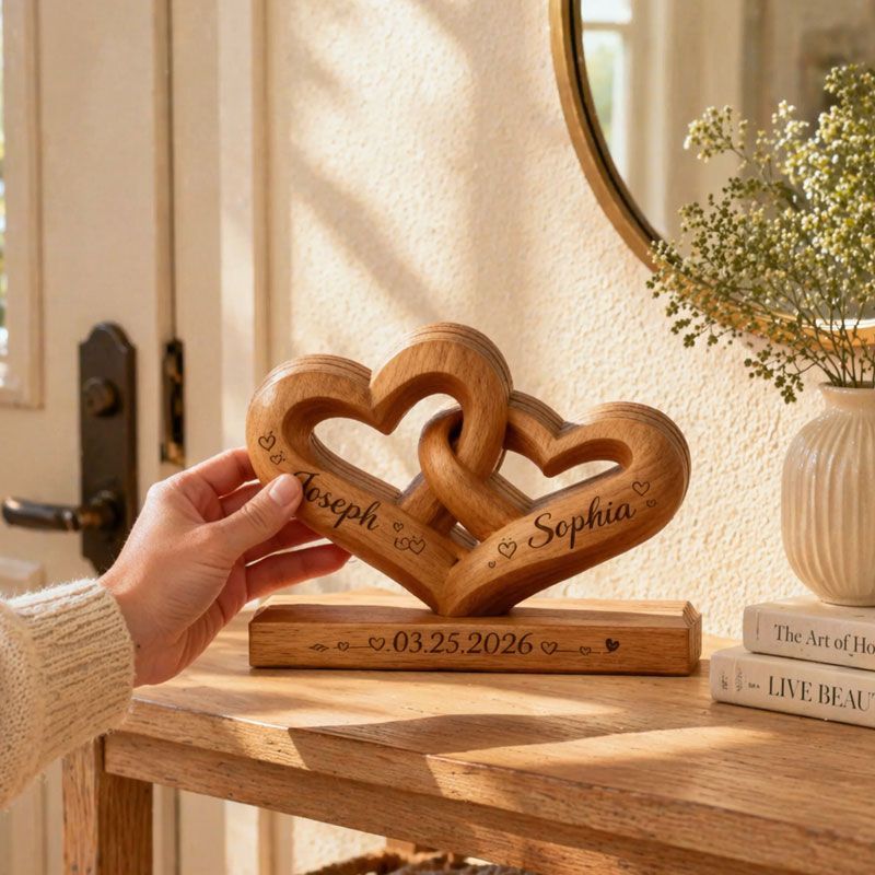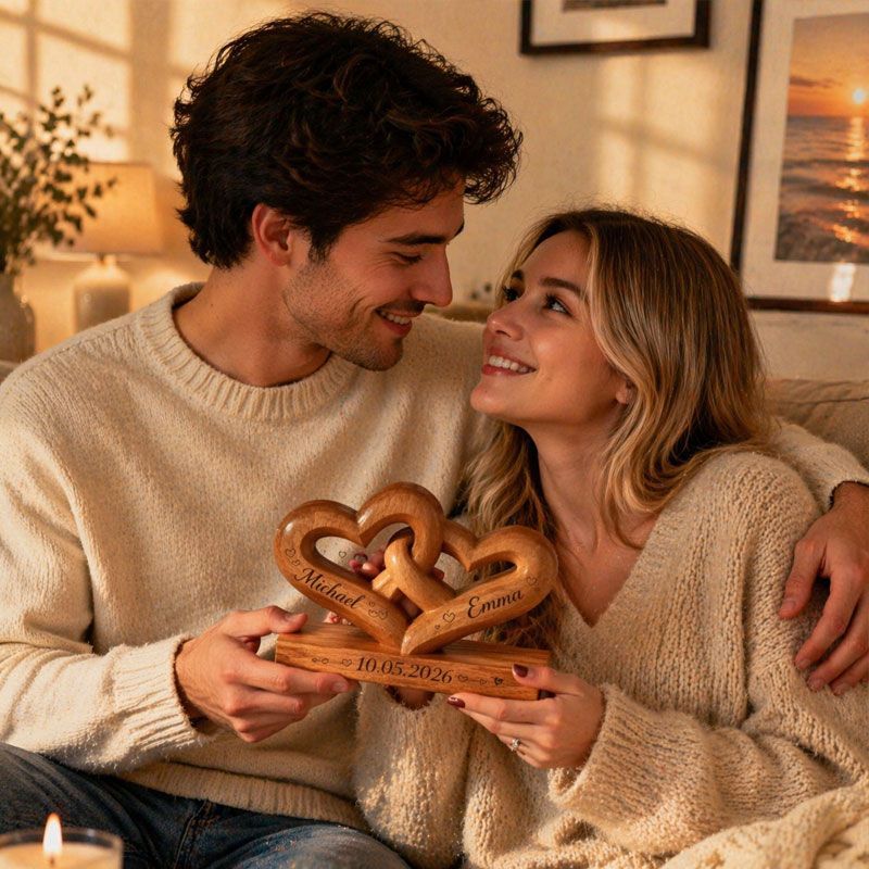 Zwei Herzen, eine Geschichte. Diese handgefertigte Holzplaque mit ineinandergreifenden Herzen symbolisiert die einzigartige Verbindung zweier Menschen – perfekt als Geschenk für Paare, Verlobte, Ehepartner oder Jubiläen.