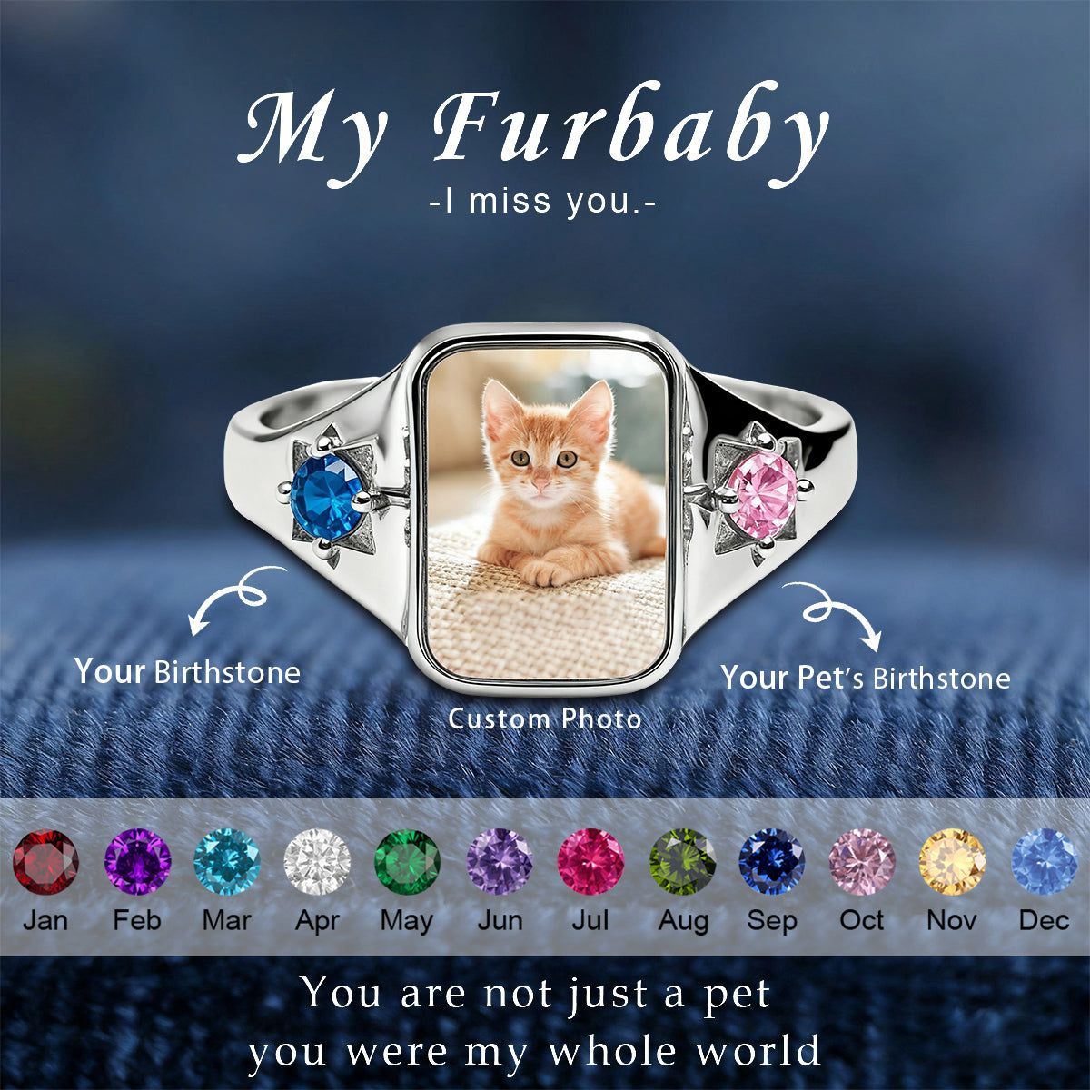 Entdecken Sie unseren individuell angefertigten Haustier-Gedenkring. Er würdigt die Erinnerung an Ihr verstorbenes Haustier und würdigt gleichzeitig die unzerbrechliche Verbundenheit. Dieses einzigartige Schmuckstück kann mit einem Foto Ihres Haustieres allein oder einem geliebten Bild von Ihnen beiden personalisiert werden. Befestigen Sie es mit Geburtssteinen, die sowohl den Geburtsmonat Ihres Haustieres als auch Ihren eigenen repräsentieren. Mit diesem sorgfältig gefertigten Ring tragen Sie die Essenz Ihrer ewigen Verbundenheit jeden Tag nah am Herzen.