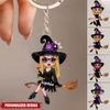 Hexenbesen reitendes geheimnisvolles Mädchen – Personalisierter Acryl-Schlüsselanhänger – Das beste personalisierte Halloween-Geschenk